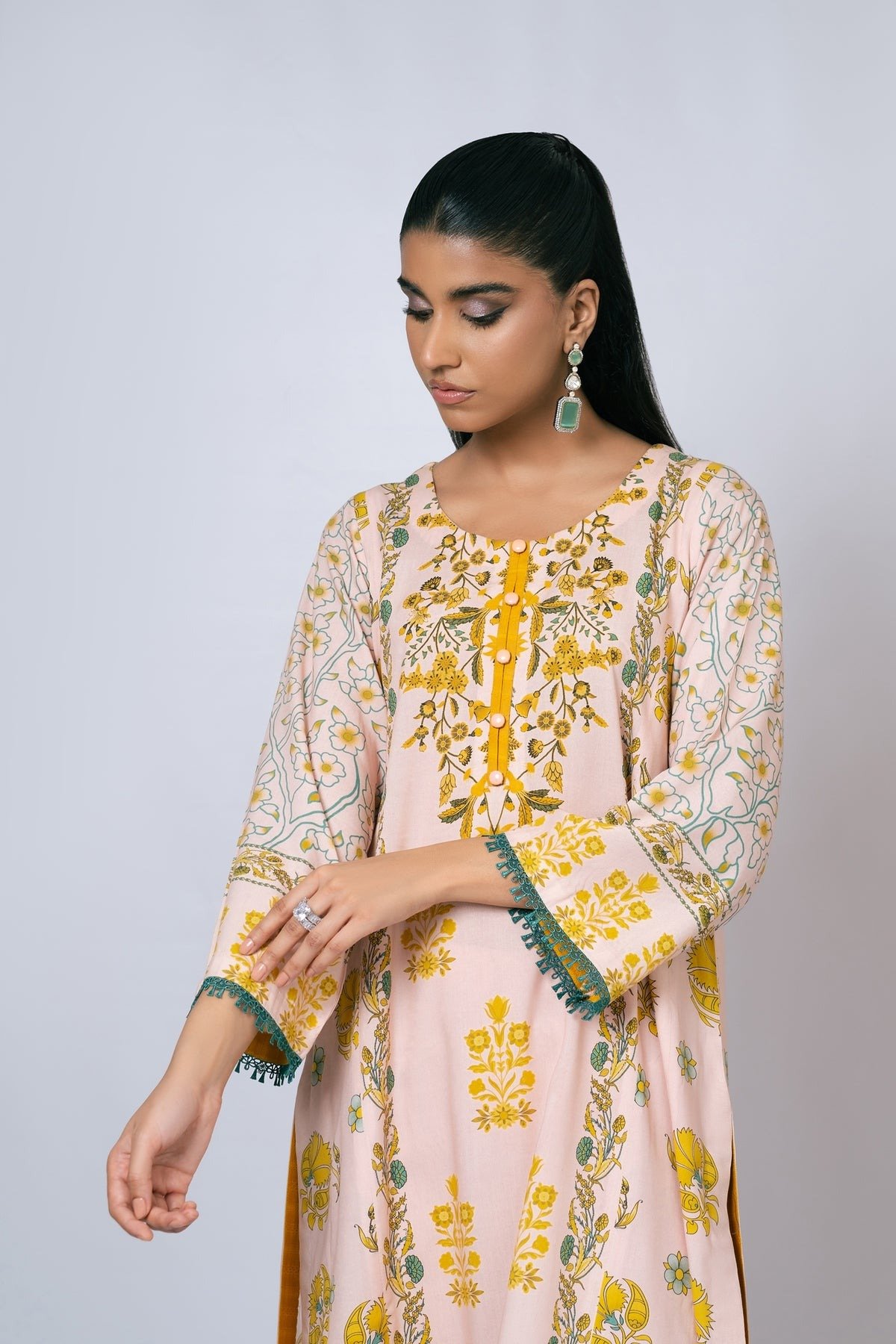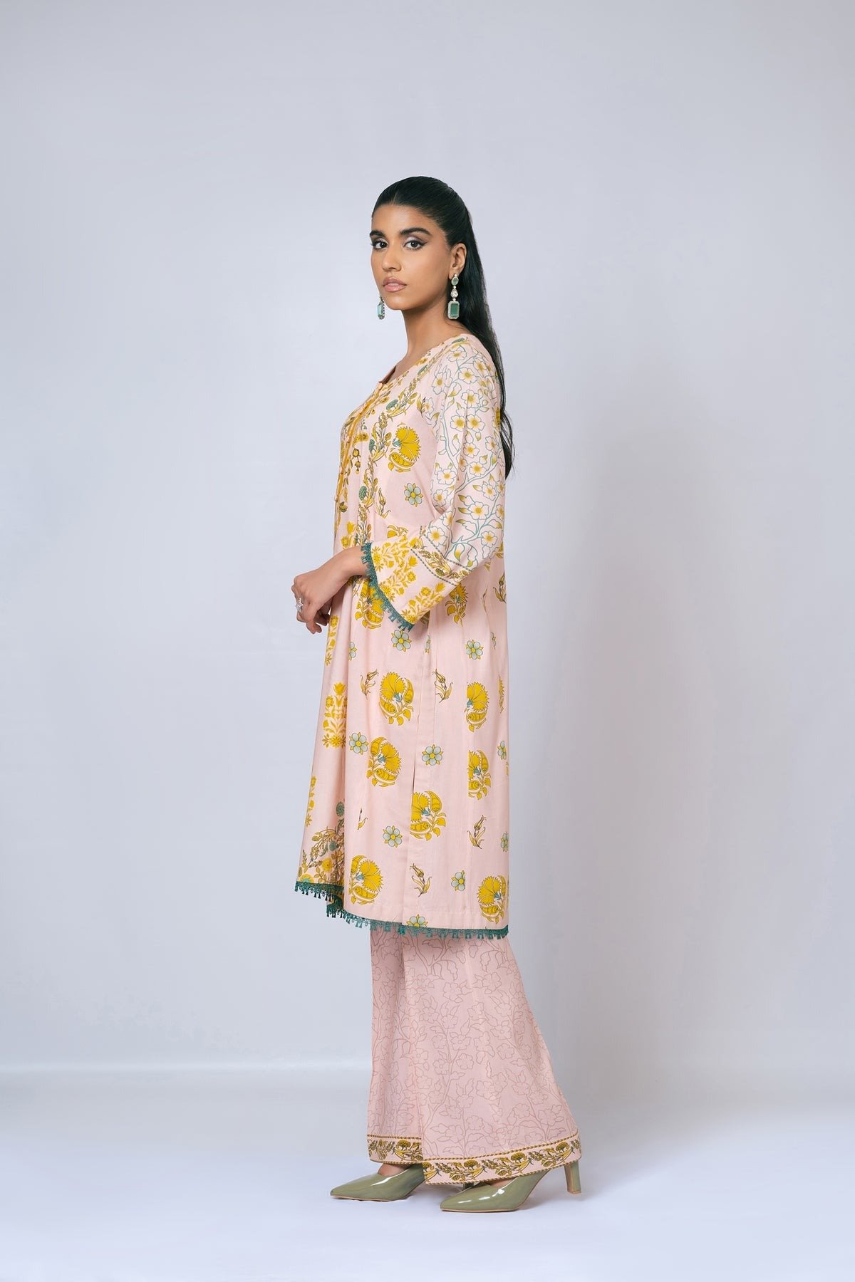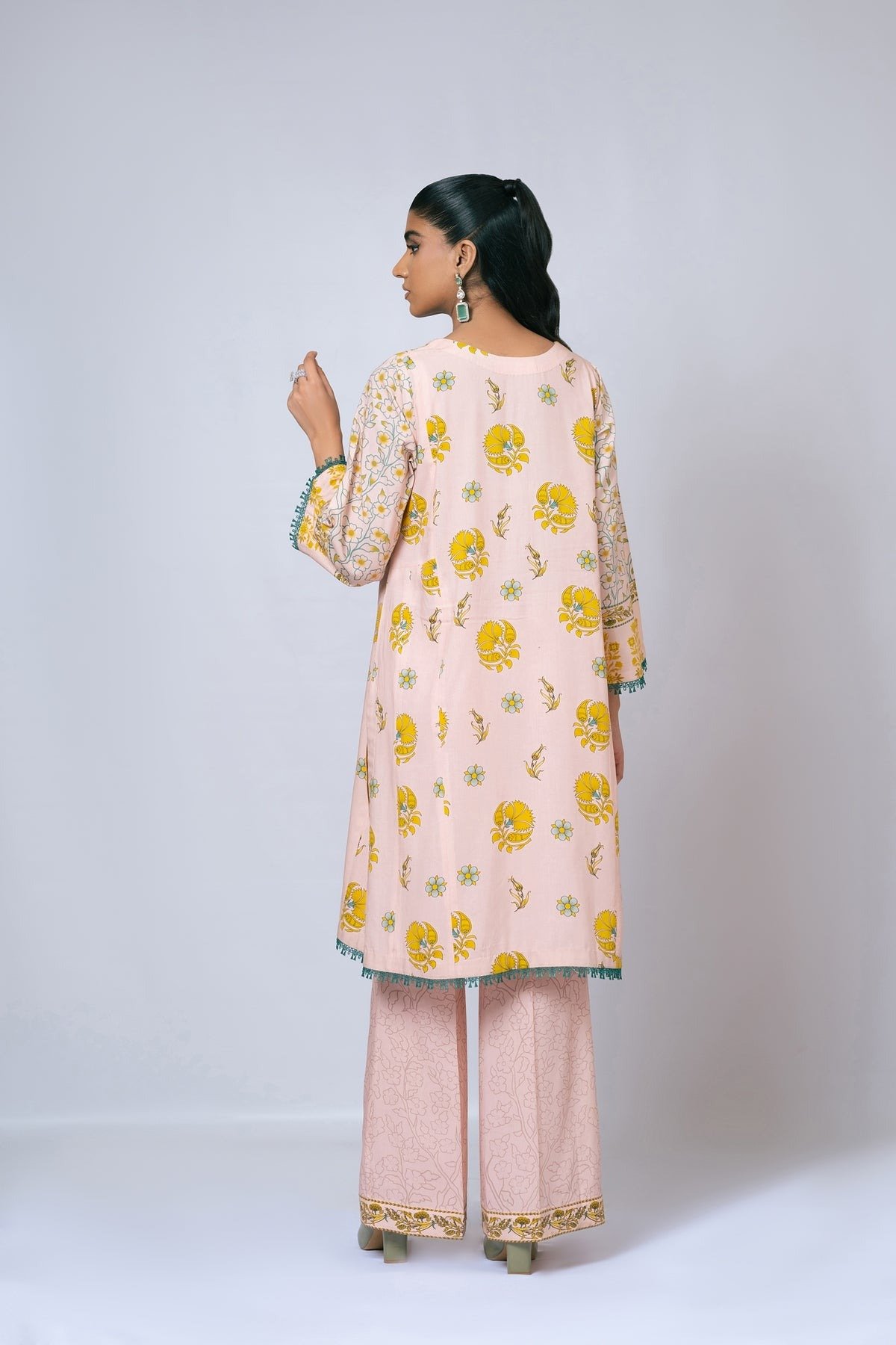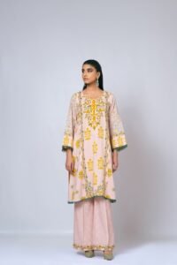This baby pink kurta dress by Khwatin is adorned with delicate mustard floral motifs inspired by Islamic art, offering a graceful blend of cultural elegance and modern simplicity. Crafted from breathable linen fabric, the subtle print and relaxed silhouette ensure all-day comfort with effortless style. Perfect for casual yet refined occasions.