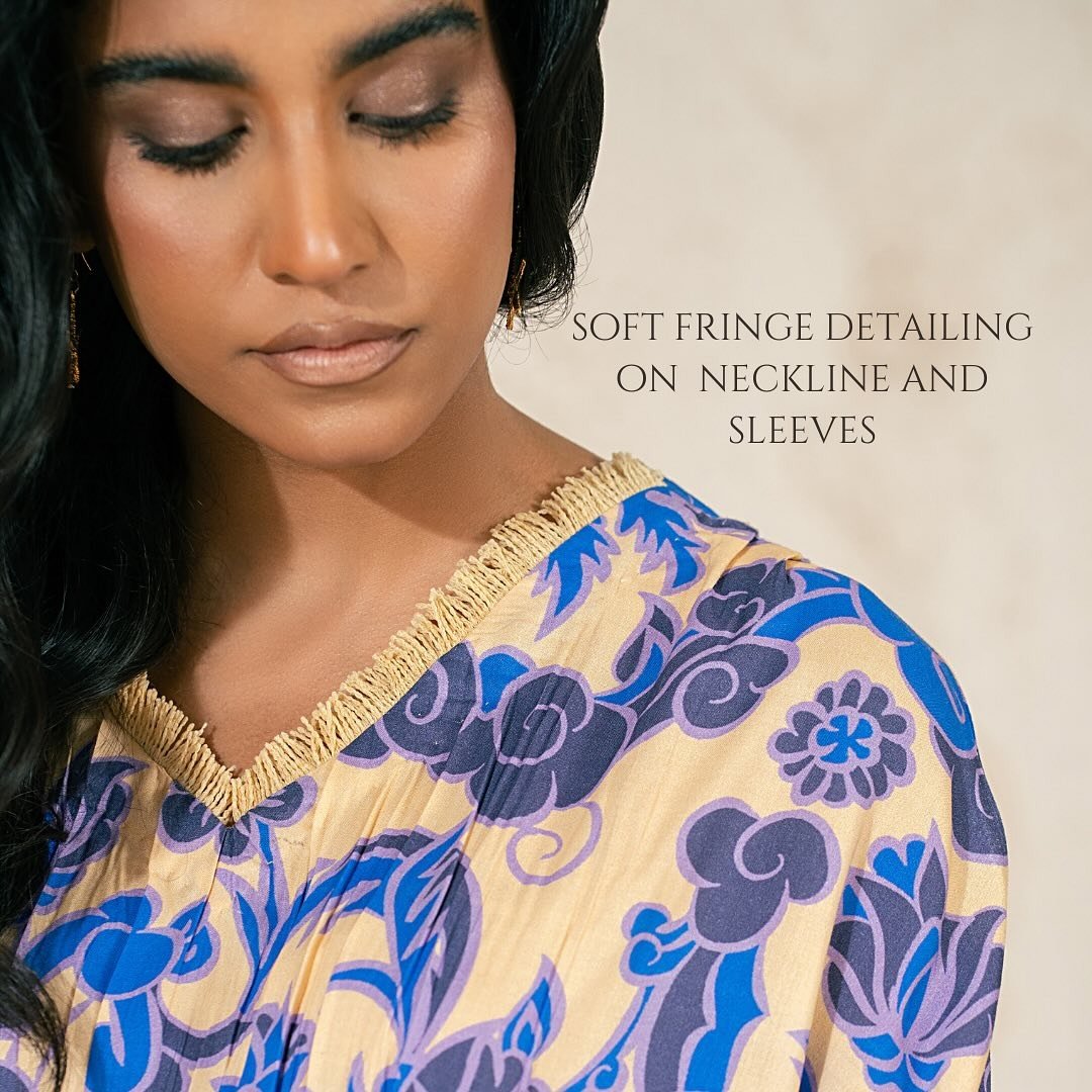 Tailored in a rich, breathable linen fabric, it offers warmth without compromising on style. The opulent design is elevated with soft beige fringe detailing adorning the graceful V-neckline and sleeves, adding texture and refined charm to the overall look.